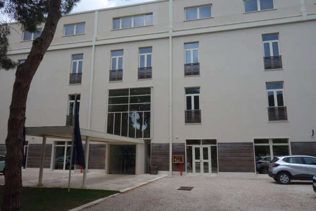 Die etwas schlichte Außenfassade vom Hotel Torre Salinas mit dem Haupteingang.