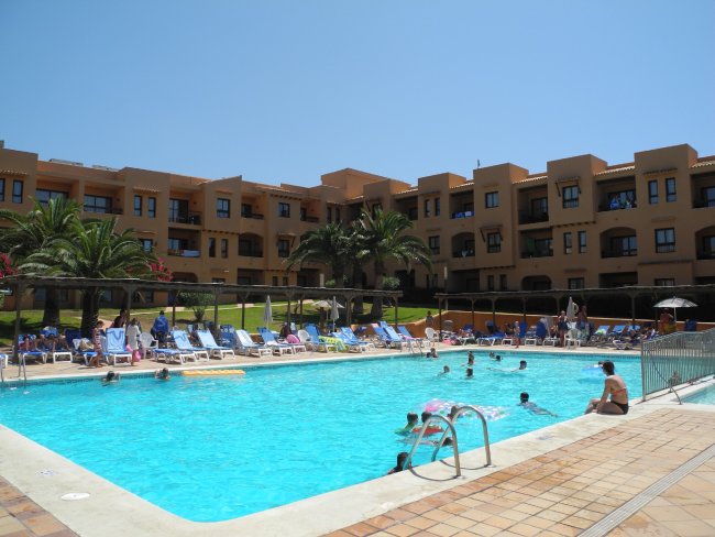 Der Pool vom Hotel Insotel Club Tarida Playa macht zusammen mit dem Hotelgebäude einen passablen Eindruck.