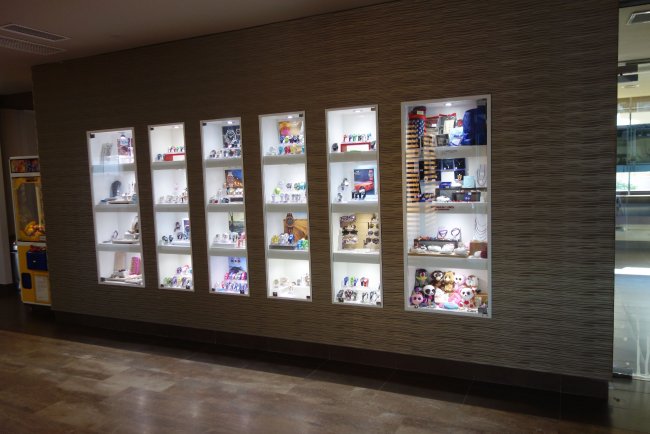 Im Hotel Augustus kann man ein paar Urlaubssachen einkaufen, die schön in solchen Schaukästen dargeboten werden.
