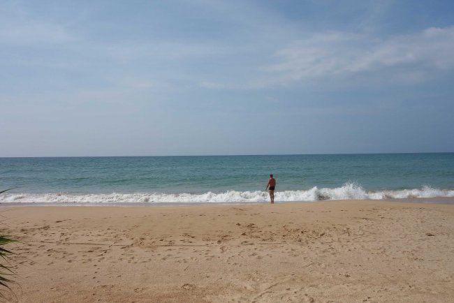 Am Strand vor dem Hotel Calamansi Cove Villas by Jetwing sind die Wellen eher kräftig.