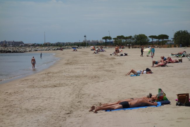 Der Strand von Roses nahe dem Hotel Monterrey fällt flach ins Meer ab.