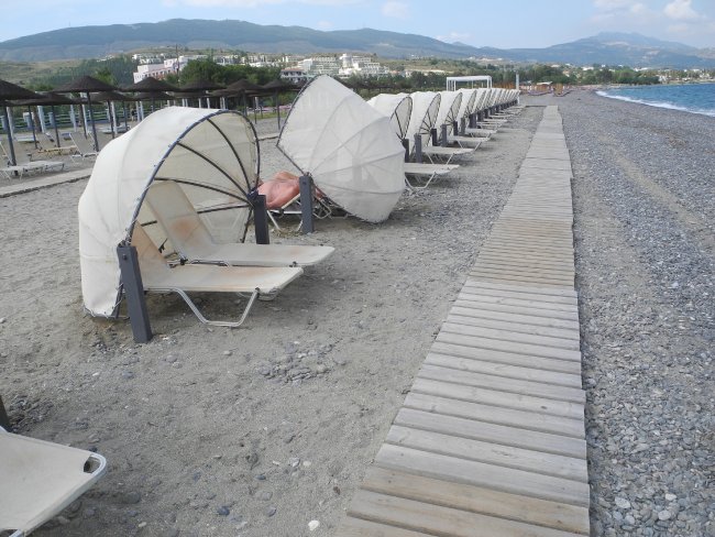 Im Hotel Kipriotis Panorama & Suites können Gäste am Strand auch solche strandmuschelähnliche Sonnenschirme nutzen.
