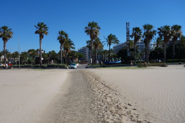 Das Hotel Blaumar Salou (Bildmitte) ist etwa 100 m vom Strand entfernt, nur die Küstenstraße und der Grünstreifen trennen das Hotel vom feinen Sandstrand.