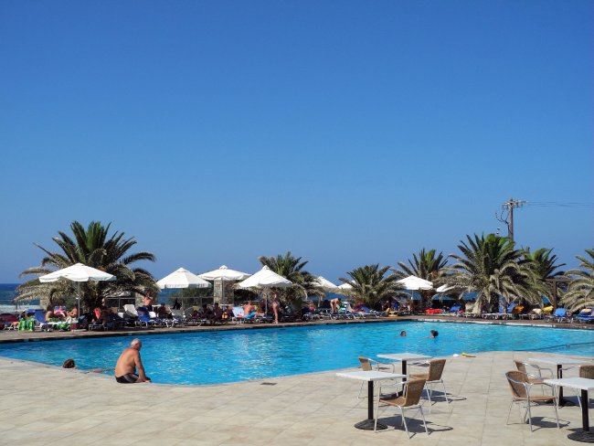 Der zweite, größere Swimmingpool vom Hotel Aphrodite Beach Club liegt näher am Meer und ist mit Salzwasser befüllt.