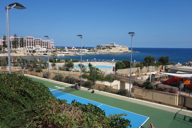 Der Tennisplatz des Hotels Hilton Malta scheint etwas reingequetscht zwischen Sonnenterrasse und Meer.