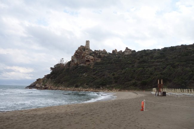 Der Turm Torre delle Saline ober halb des Hotel Torre Salinas isz namensgebend für den Strandabschnitt und das Hotel.