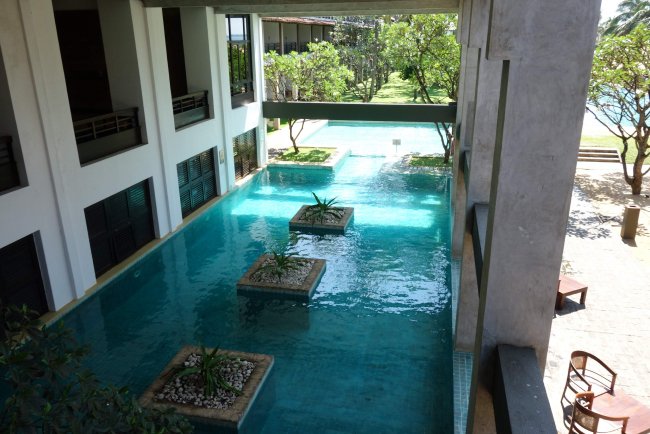 Der Pool direkt am Hotel Jetwing Beach liegt zur Hälfte unter einem Dach, weshalb hier auch gut Kinder baden können.