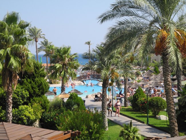 Die Gartenanlage vom Hotel Atlantica Aegean Blue bietet mit einigen Palmen einen sehr üppigen Gartenbereich.