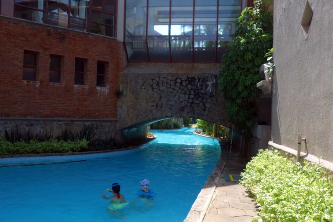 Der Pool ist zweigeteilt, unter einer Art Brücke geht er auch in einen weiteren Poolbereich über. Damit kann man hier sehr ausgiebig schwimmen.