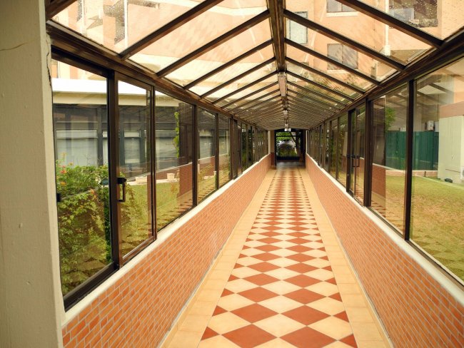 Zwischen zwei Hotelgebäuden führt ein Verbindungsgang trockenen Fußes hin und her, falls es mal regnen sollte.