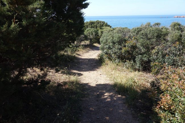 Die Gäste vom Hotel Relax Torreruja Thalasso & SPA können am felsigen Küstenbereich auf Holzdecks sonnen, dieser unbefestigte Weg führt durch das Gebüsch.