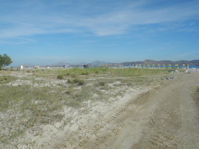 Der Weg zum Strand ist vom Hotel Tigkaki's Star aus schon an die 300 m weit und führt entlang einer naturbelassenen, staubigen und flachen Straße, die durch den flachen Bereich der Düne führt.
