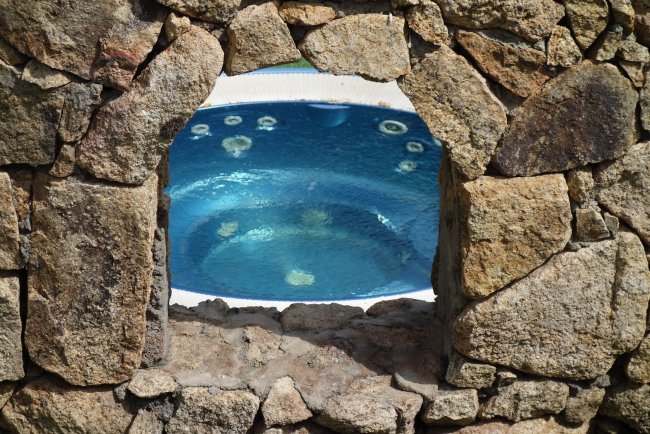 In der Ecke des Gartens ist ein Whirlpool eingerichtet, umgeben von einer Steinmauer.