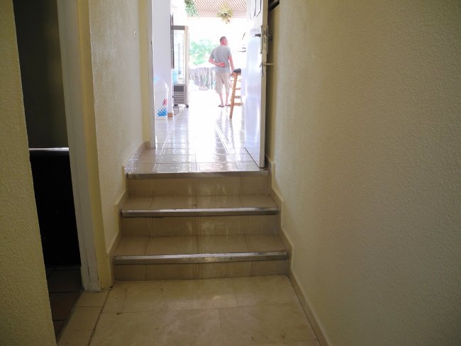Innerhalb des Hotels erfolgt der Zugang zum Poolbereich über diese Treppen